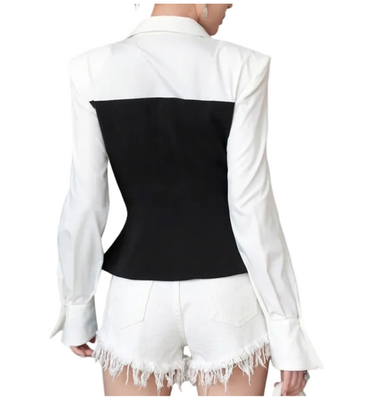 Trendy & Elegant Long Sleeve Lapel V-Neck Black & White Contrast Peplum Blazer - B4-BLZ-05