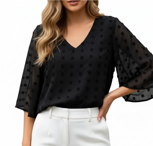 Chiffon V-neck self-embroidered dots Fabric with Half Short Flare Sleeve Blouse for Women- BL4