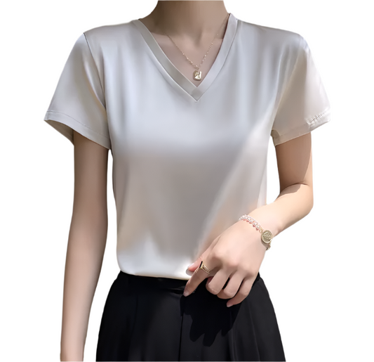 Classy & Timeless Silk V-neck Solid Color Short Sleeved Women's T-shirt Blouse - B6-TOP-B616
