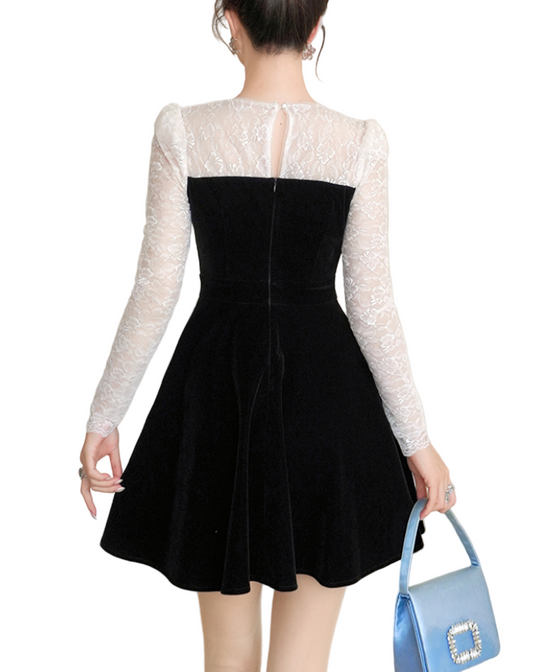 Timeless & Elegant Lace Long Sleeve Versatile Black Velvet Short Dresses - B4-DRESS-B379