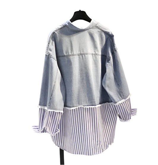 Trendy Striped Flip Collar Loose Fit Denim Spliced Women's Shirts -B6-TOP-B691