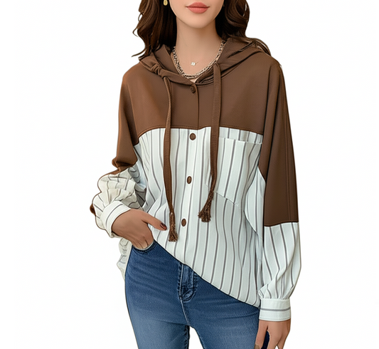 Trendy Striped Hooded Sweater Loose Fit Two-Tone Women's Shirts - B6-TOP-B696