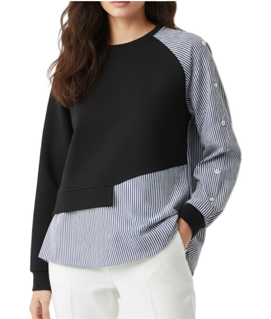 Round Neck Irregular Striped Patchwork Two-tone Cotton Shirt Hoodies - B6-TOP-B672