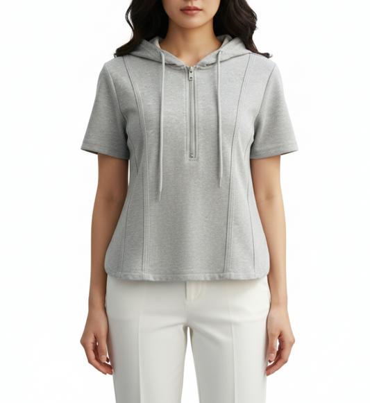 Trendy Zipped Hooded Short Sleeve Tops for Women- B6-TOP-B667