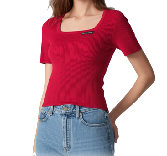 Square Neck Ice Silk Knitted Short Sleeve Women's T-shirt Blouse- B6-TOP-B654