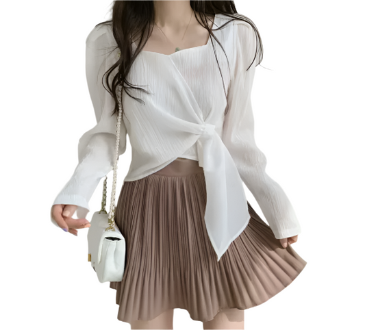 Trendy Short-sleeve Pleated Neck Front Waist Belt Blouse for Women-TOP-B1-BL-237