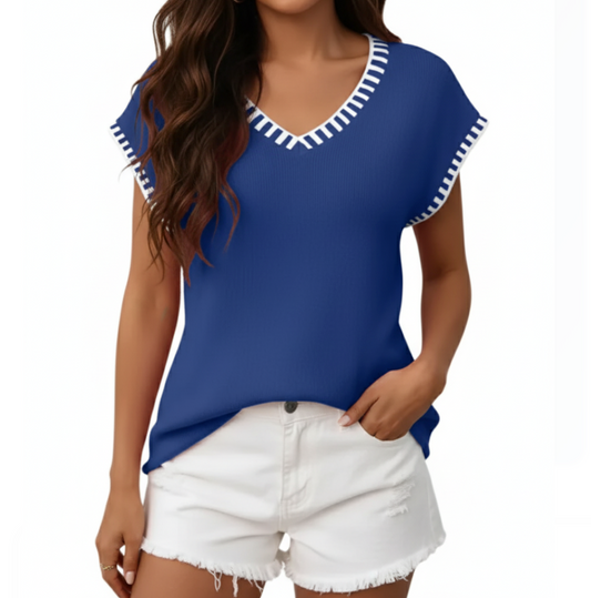 Trendy Short-Sleeved V-Neck Thin Knitted Pullover Woman's Shirt TOP-B1-BL-239