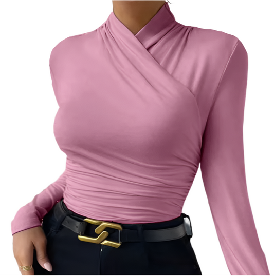 Trendy Pleated Crossing Collar Long Sleeve Slim-fit Woman's Shirt TOP-B1-BL-234