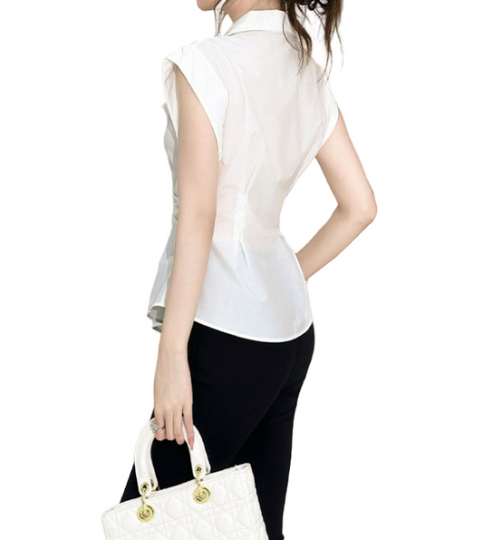 Timeless & Elegant Cap Sleeve Ruched Waist Flap-Pockets Blouses - B4-TOP-B10