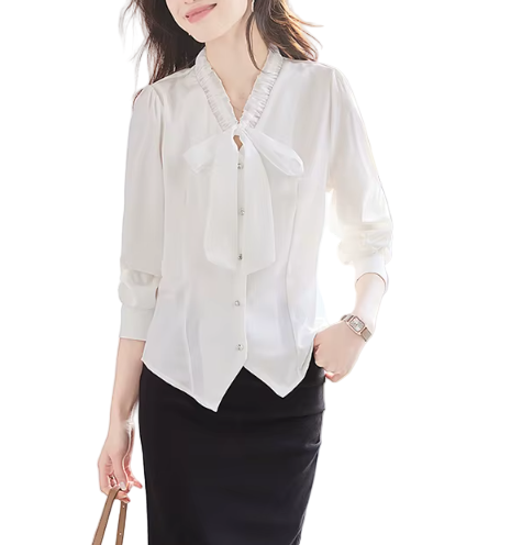 Trendy & Timeless Long Sleeve V-Bow-Neck Button-up Blouses for Women - B15-TOP-32
