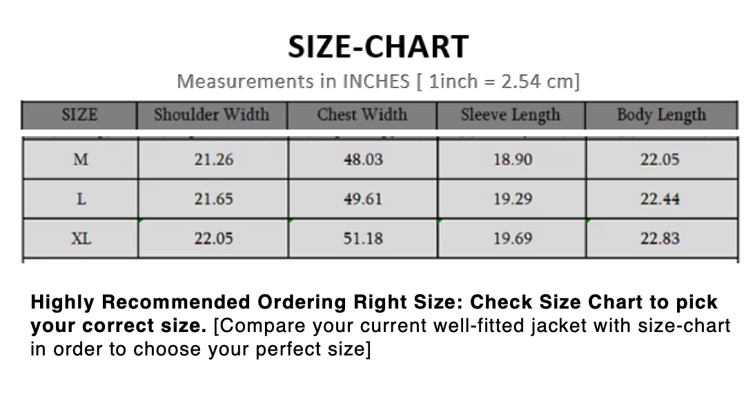 Highly Recommended Ordering Right Jacket Size: Check Size Chart to pick your correct size. [Compare your current well-fitted jacket with size-chart in order to choose your perfect size]